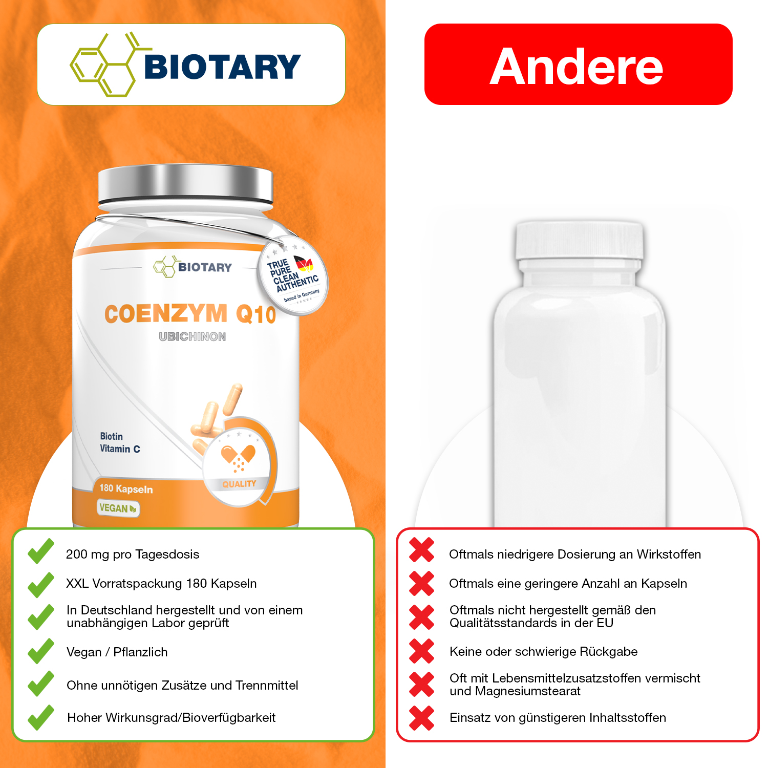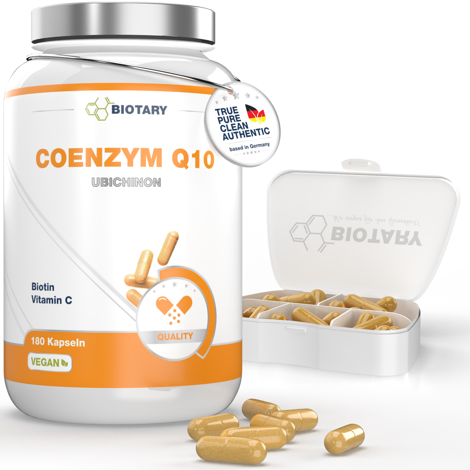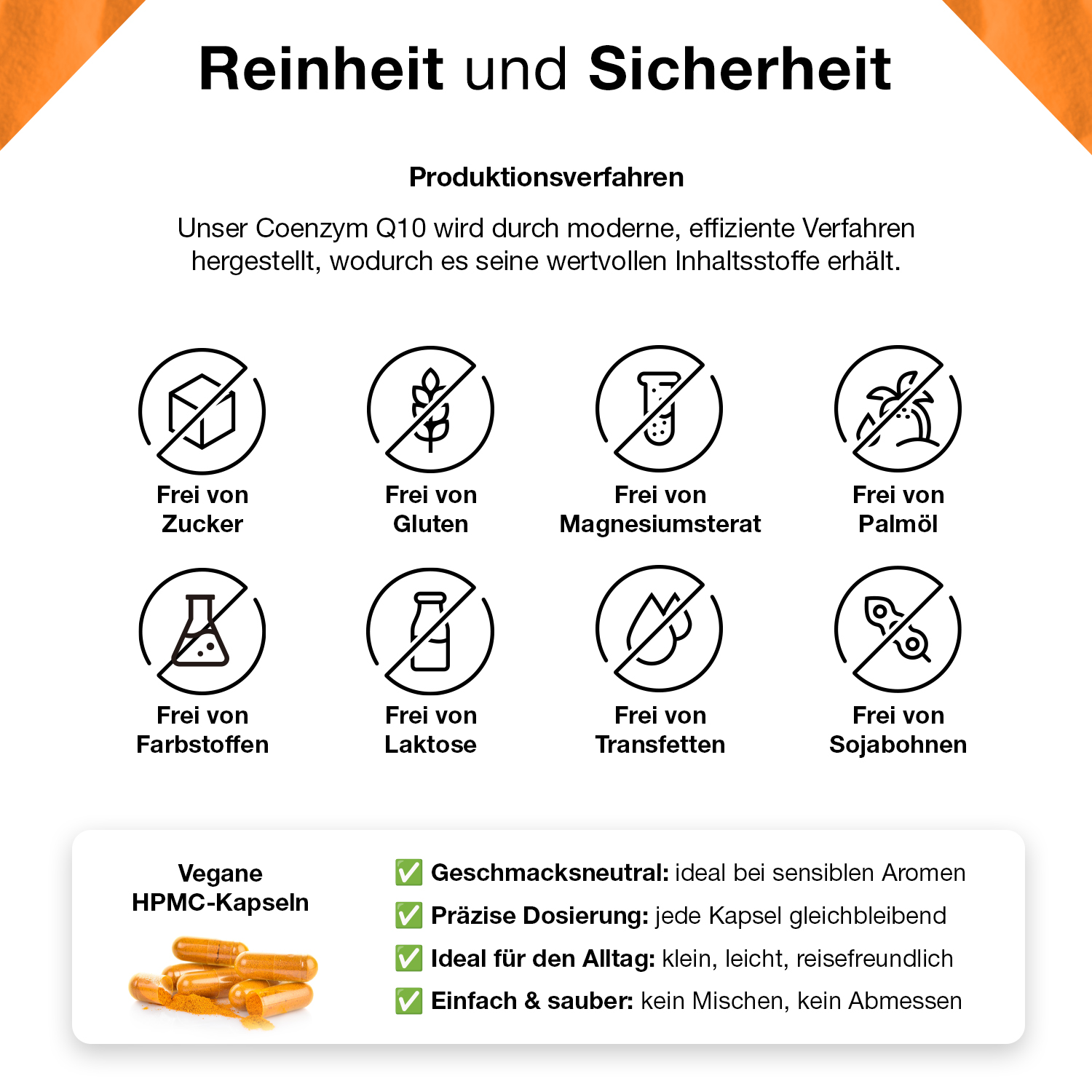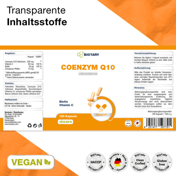 Füllmittel: Reisstärke, Coenzym Q10, Cellulose (Kapselhülle), Ascorbinsäure (Vitamin C), schwarzer Pfeffer (gemahlen), Niacin (Vitamin B3), Biotin (Vitamin B7)