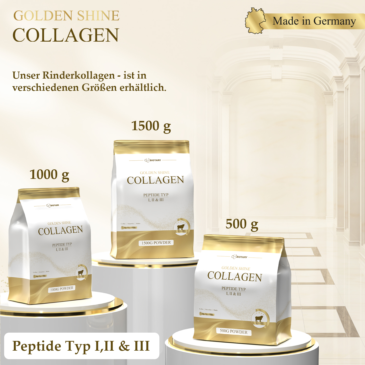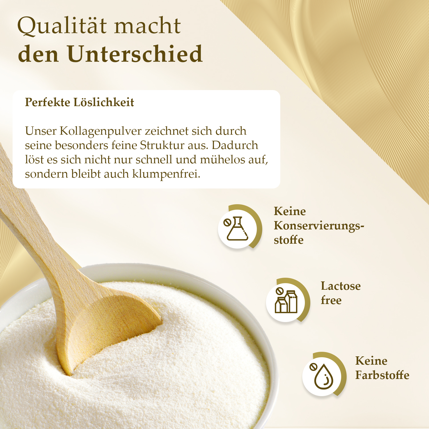 Täglich 2 Messlöffel Kollagen Pulver (20g) in Wasser, Shakes, Smoothies, Suppen, Tee oder Kaffee einrühren.