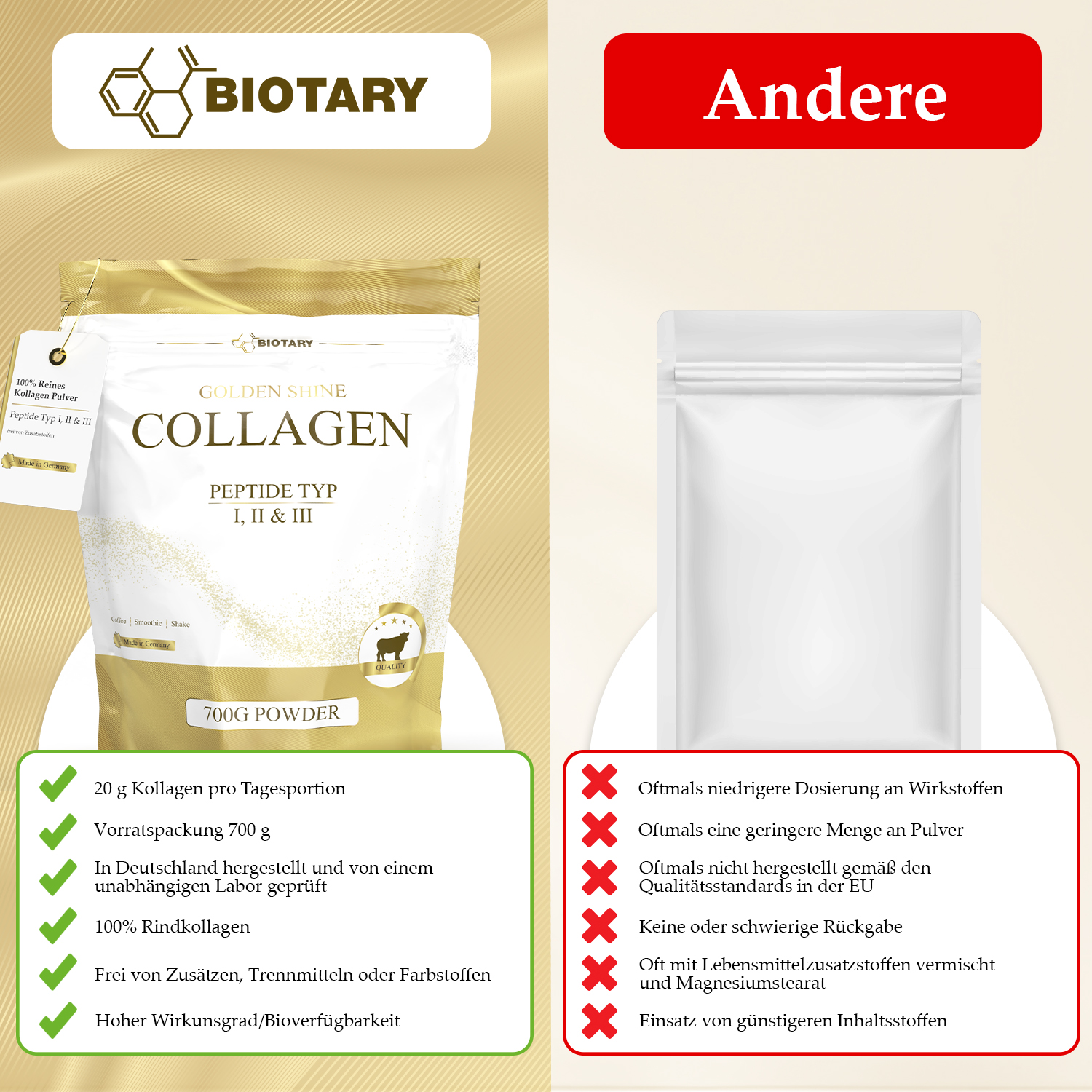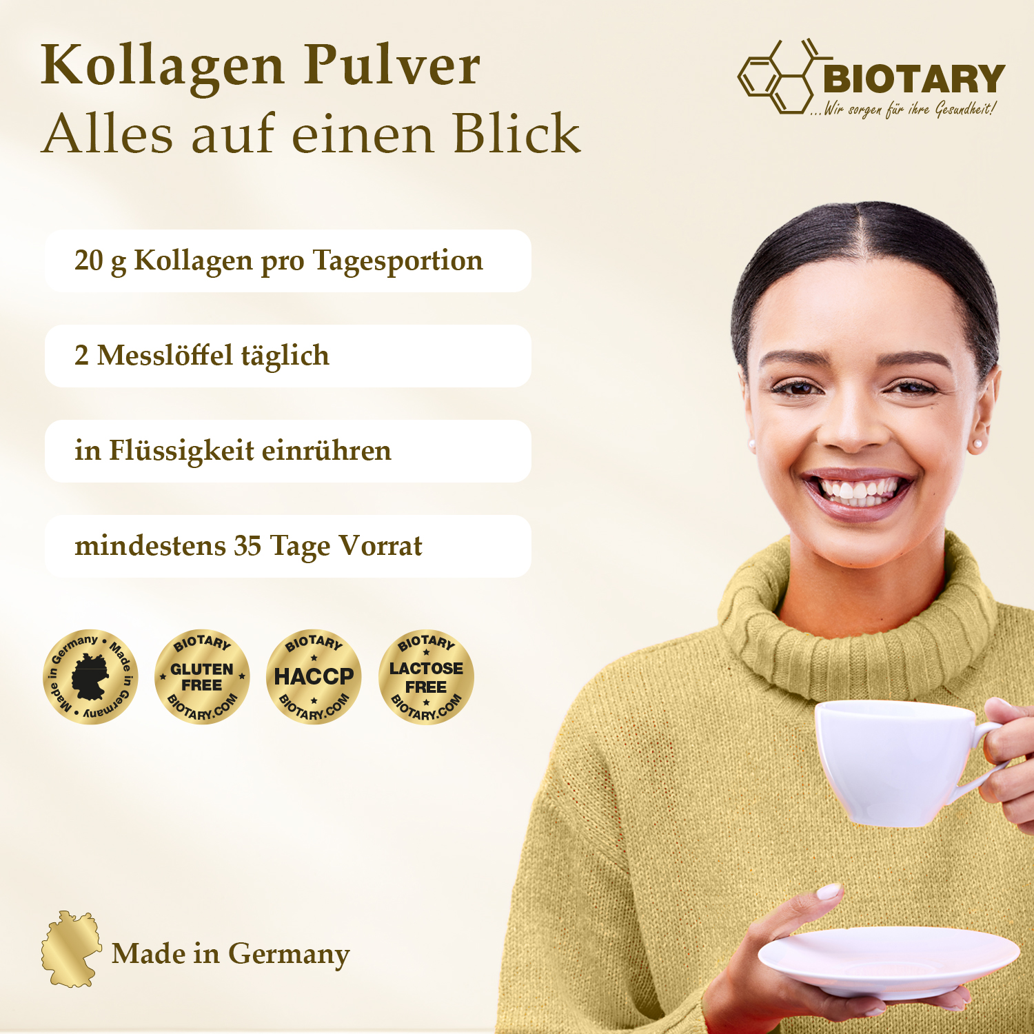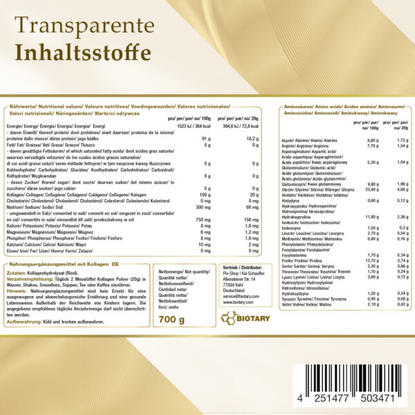 Täglich 2 Messlöffel Kollagen Pulver (20g) in Wasser, Shakes, Smoothies, Suppen, Tee oder Kaffee einrühren.