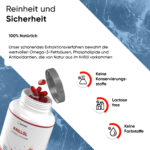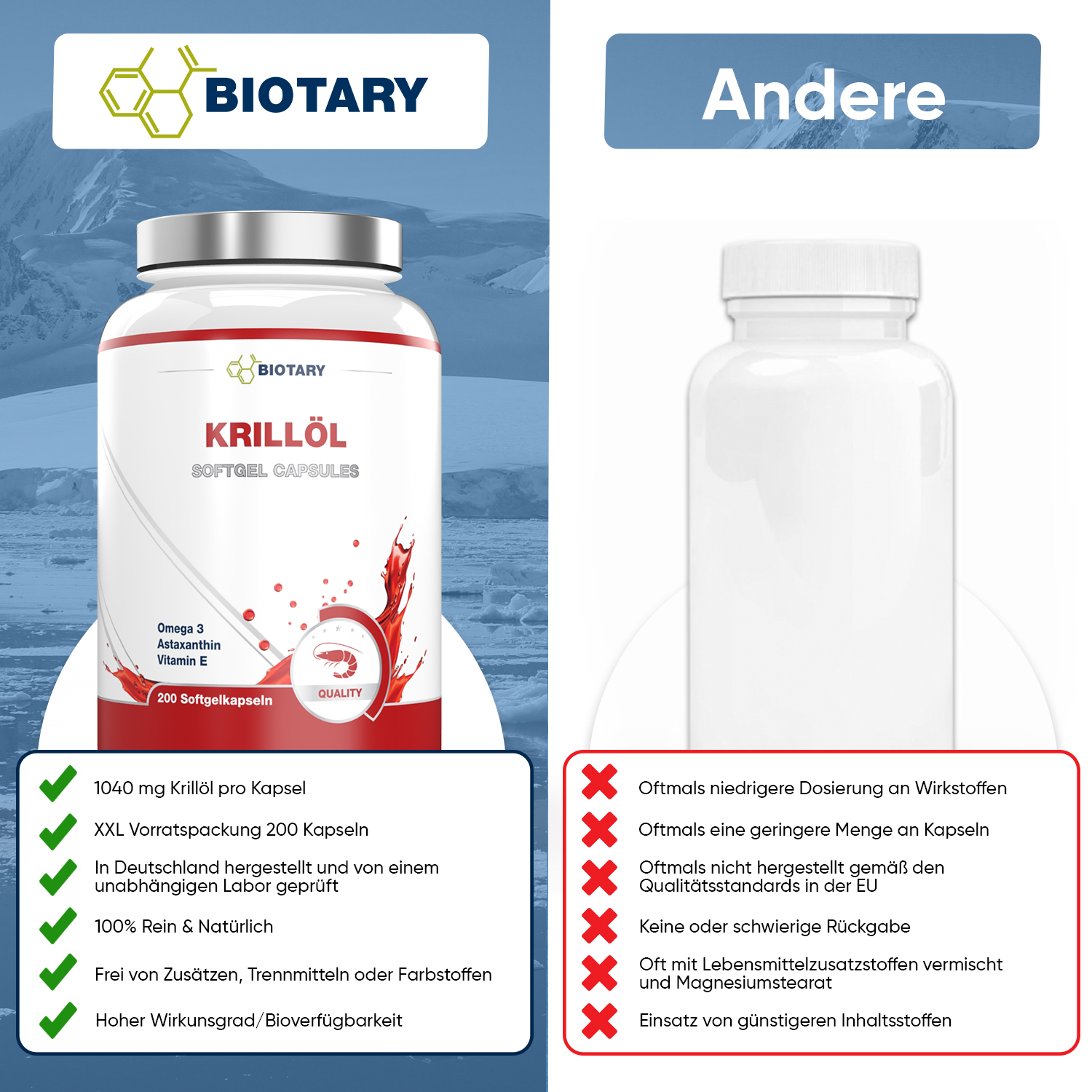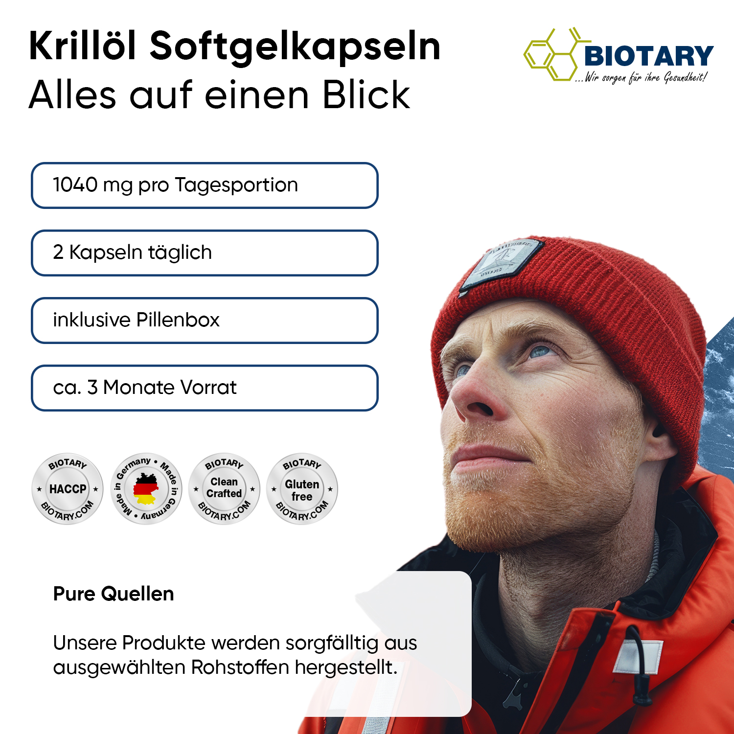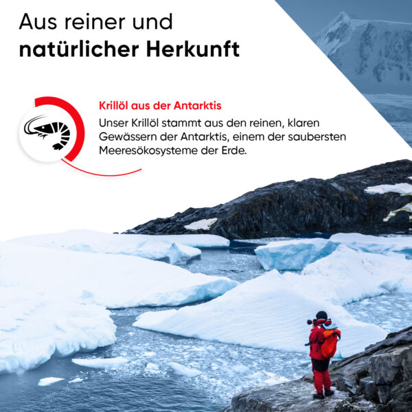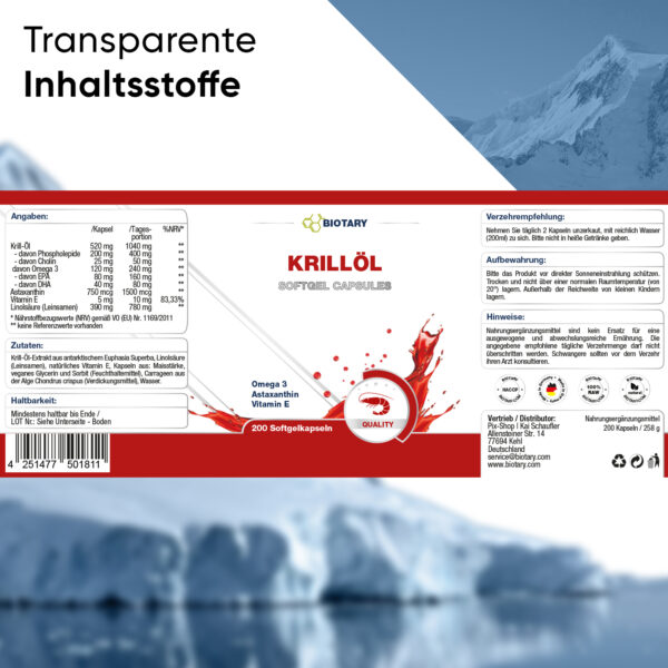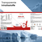 Krill-Öl-Extrakt aus antarktischem Euphasia Superba, Linolsäure (Leinsamen), natürliches Vitamin E, Bienenwachs, Kapseln aus: Maisstärke, veganes Glycerin und Sorbit (Feuchthaltemittel), Carrageen