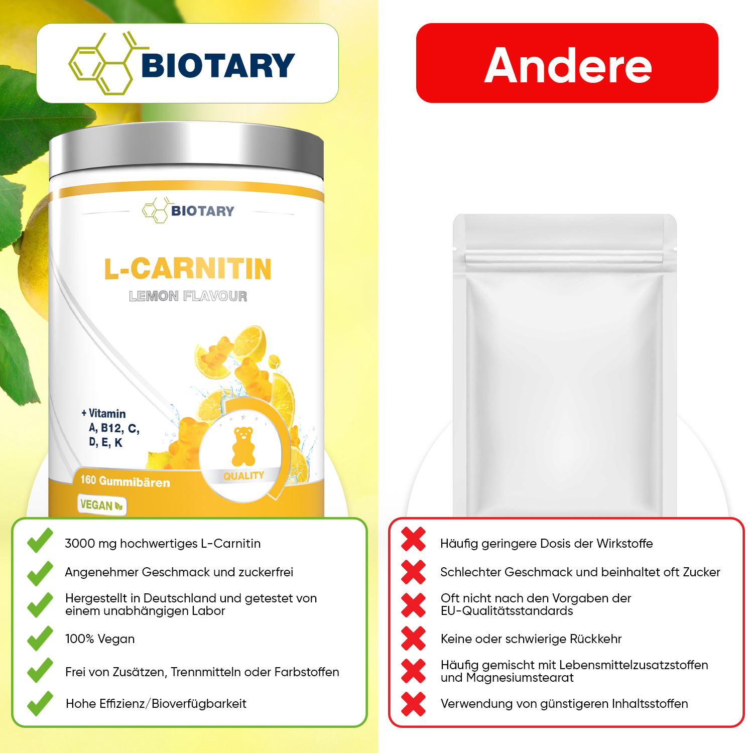 L-Carnitin-Tartrat, Glukosesirup, Pflanzliches Öl, Zitronensäure, Zitronen-Aroma Natriumcitrat, Retinylpalmitat (Vitamin A), Methylcobalamin (Vitamin B), Ascorbinsäure (Vitamin C), Cholecalciferol (Vitamin D), dl-Alpha-Tocopherylacetat (Vitamin E), Menachinon-7 (Vitamin K)