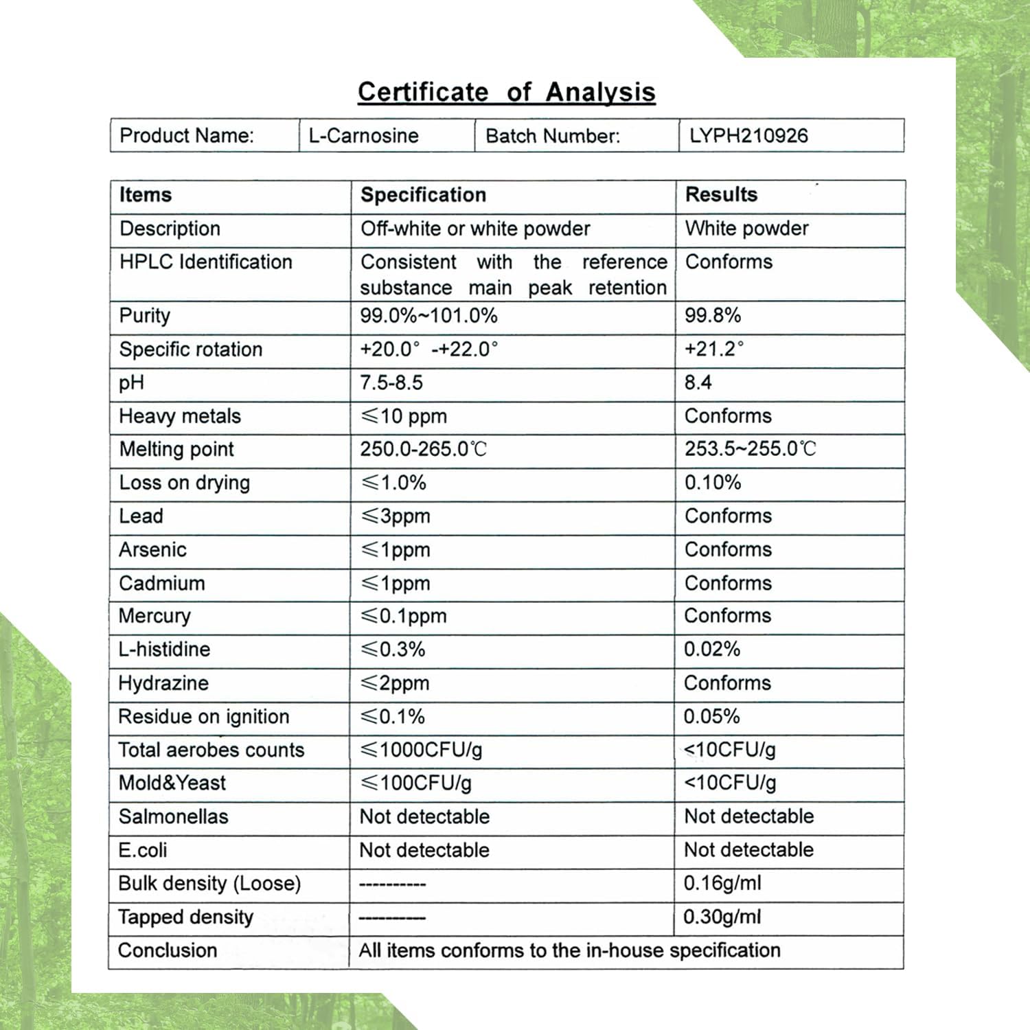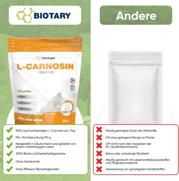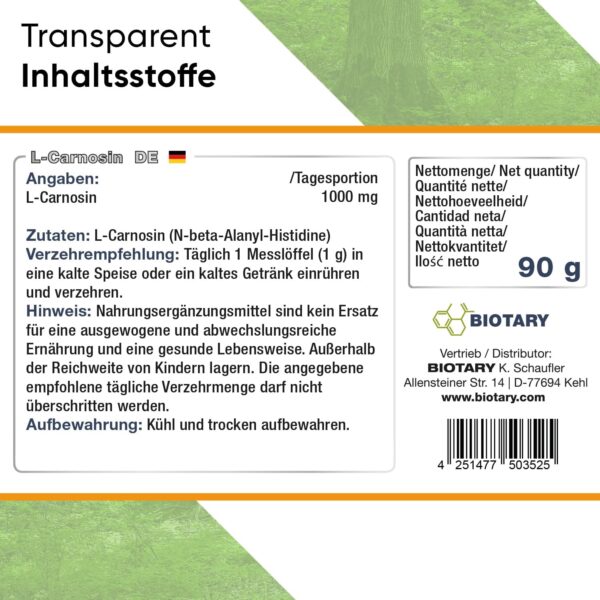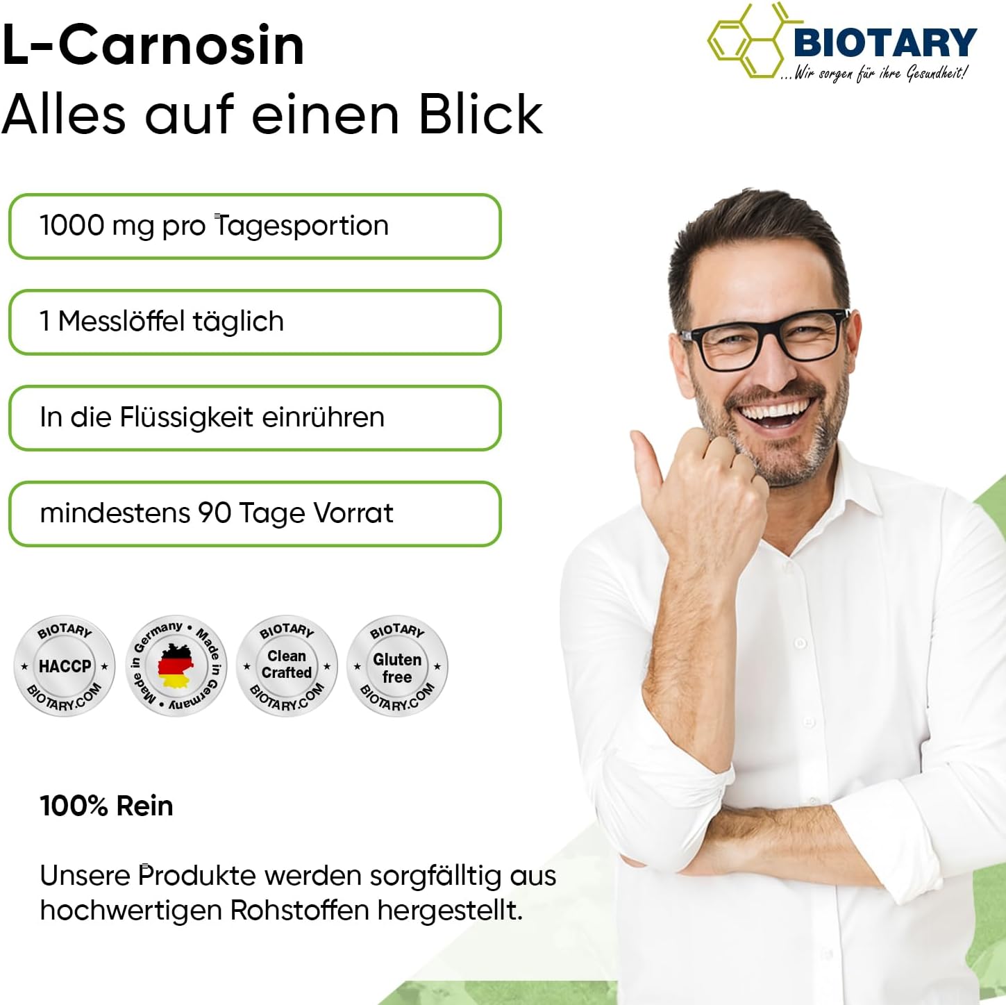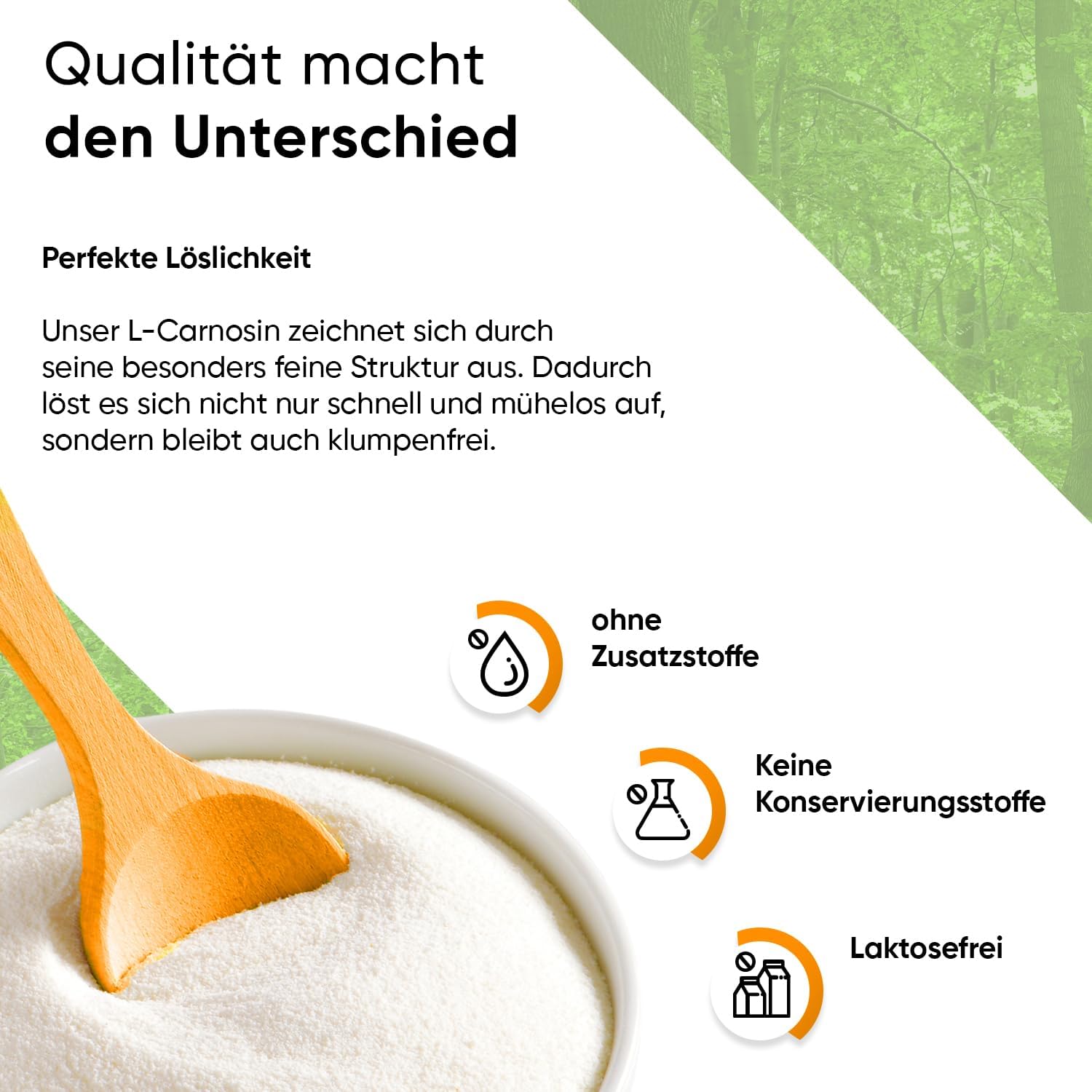 L-Carnosin Pulver 90g, 1000 mg Tagesportion, inkl. Messlöffel, 100% reines veganes L-Carnosin Pulver, hochdosiert und ohne Zusatzstoffe, Laborgeprüft