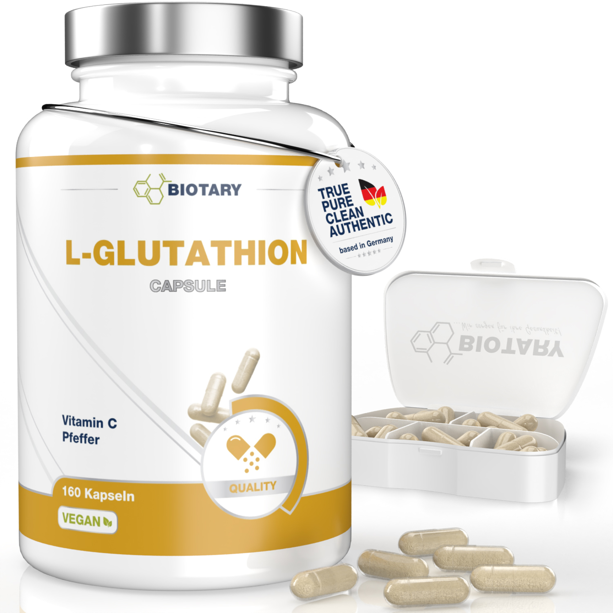 L-Glutathion, L-Ascorbinsäure (Vitamin C), Pfeffer, Hydroxypropylmethylcellulose (pflanzliche Kapselhülle).