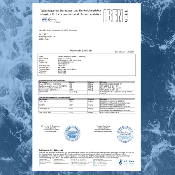 Fischöl TG (18 % EPA / 12 % DHA), Überzugsmittel: Softgel-Kapsel aus Rindergelatine, Feuchthaltemittel Glycerin, natürliches Vitamin E (D-alpha-Tocopherol)