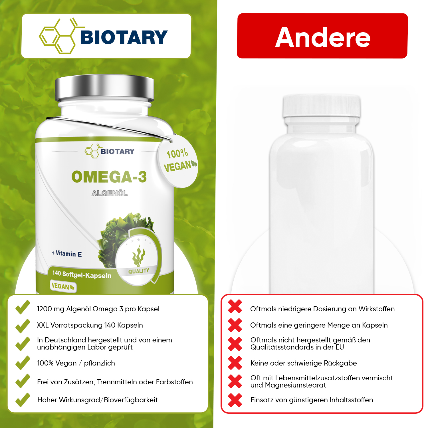 Mikroalgenöl aus Schizochytrium sp, Kapsel: modifizierte Maisstärke, Befeuchtungsmittel: Glycerin, Verdickungsmittel Carrageen, Vitamin E, Antioxidationsmittel: Tocopherolmischung, Säureregulator: Natriumcarbonat