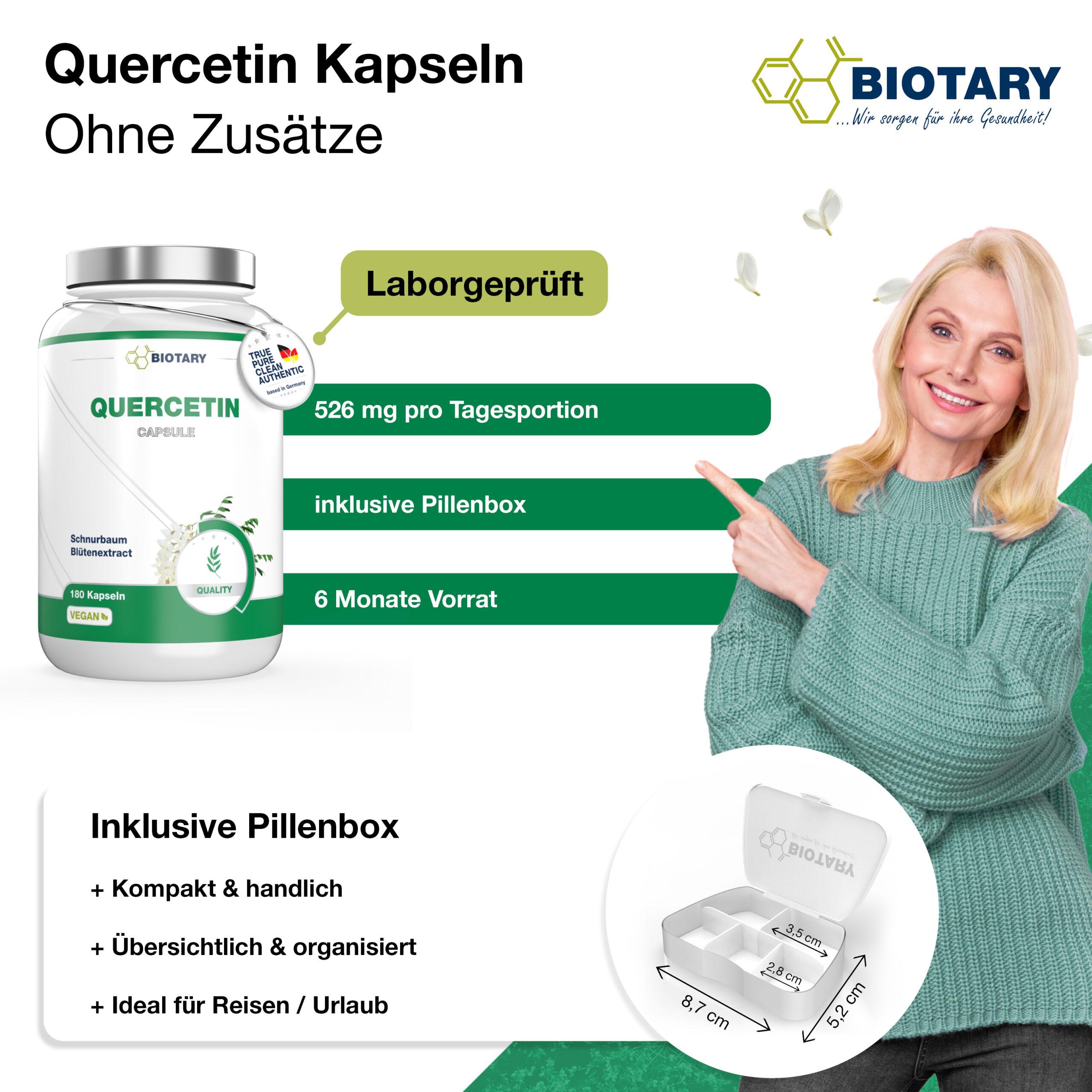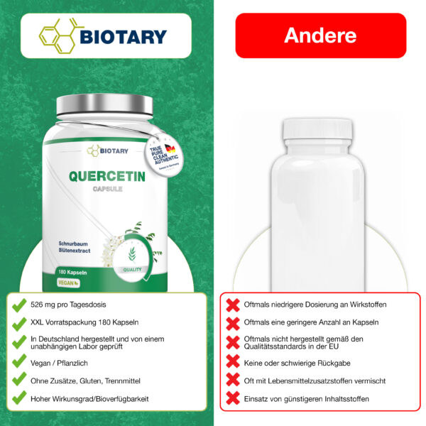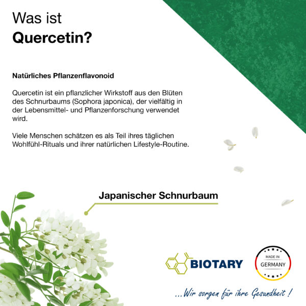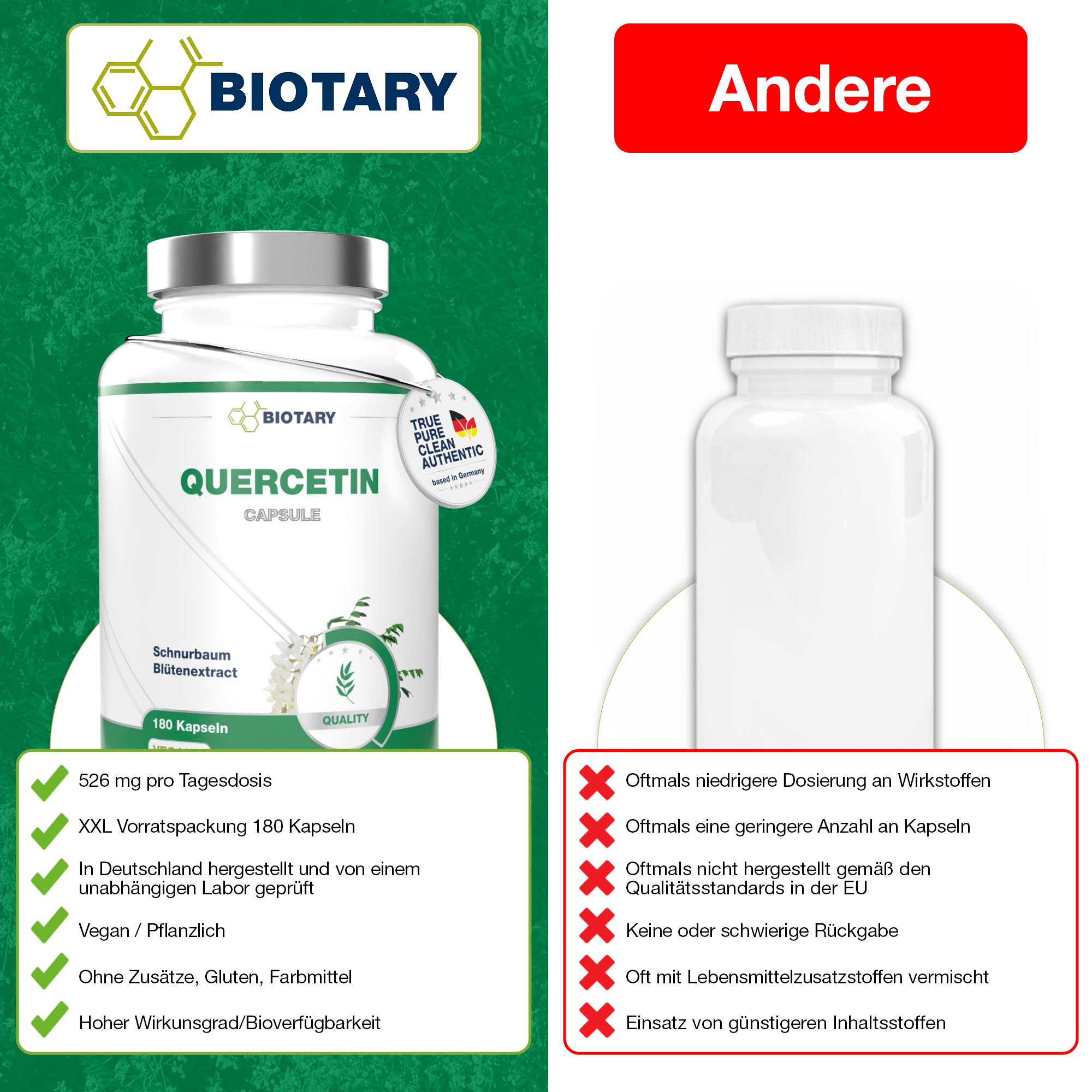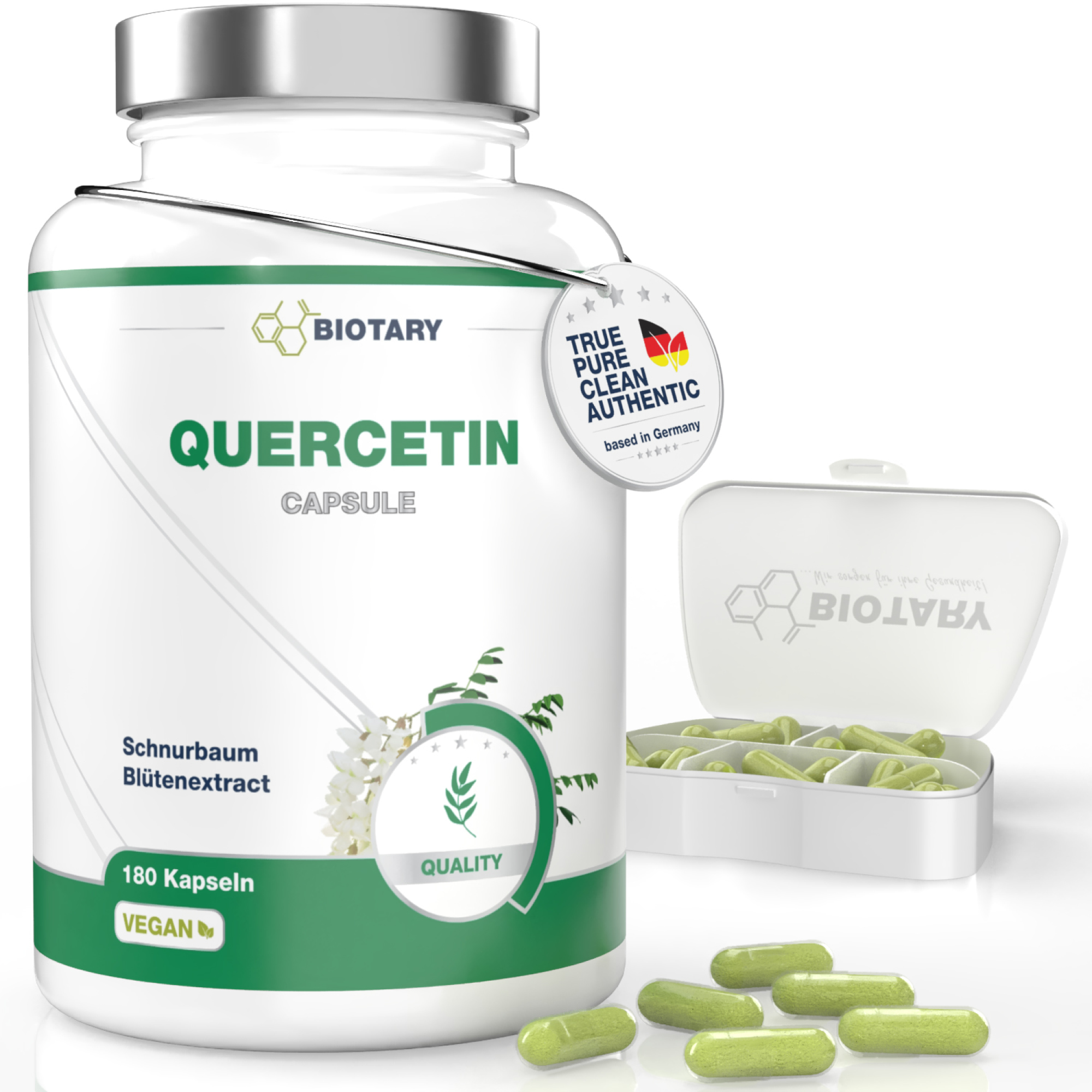 BIOTARY Quercetin | 180 Kapseln á 526 mg | inklusive Pillenbox | Hochdosierte Premium Qualität | 6 Monate Vorrat | Vegan | natürlich aus 98% japanischem Schnurbaum-Blütenextrakt | Ohne Magnesiumstearat oder andere Zusätze | Antioxidans