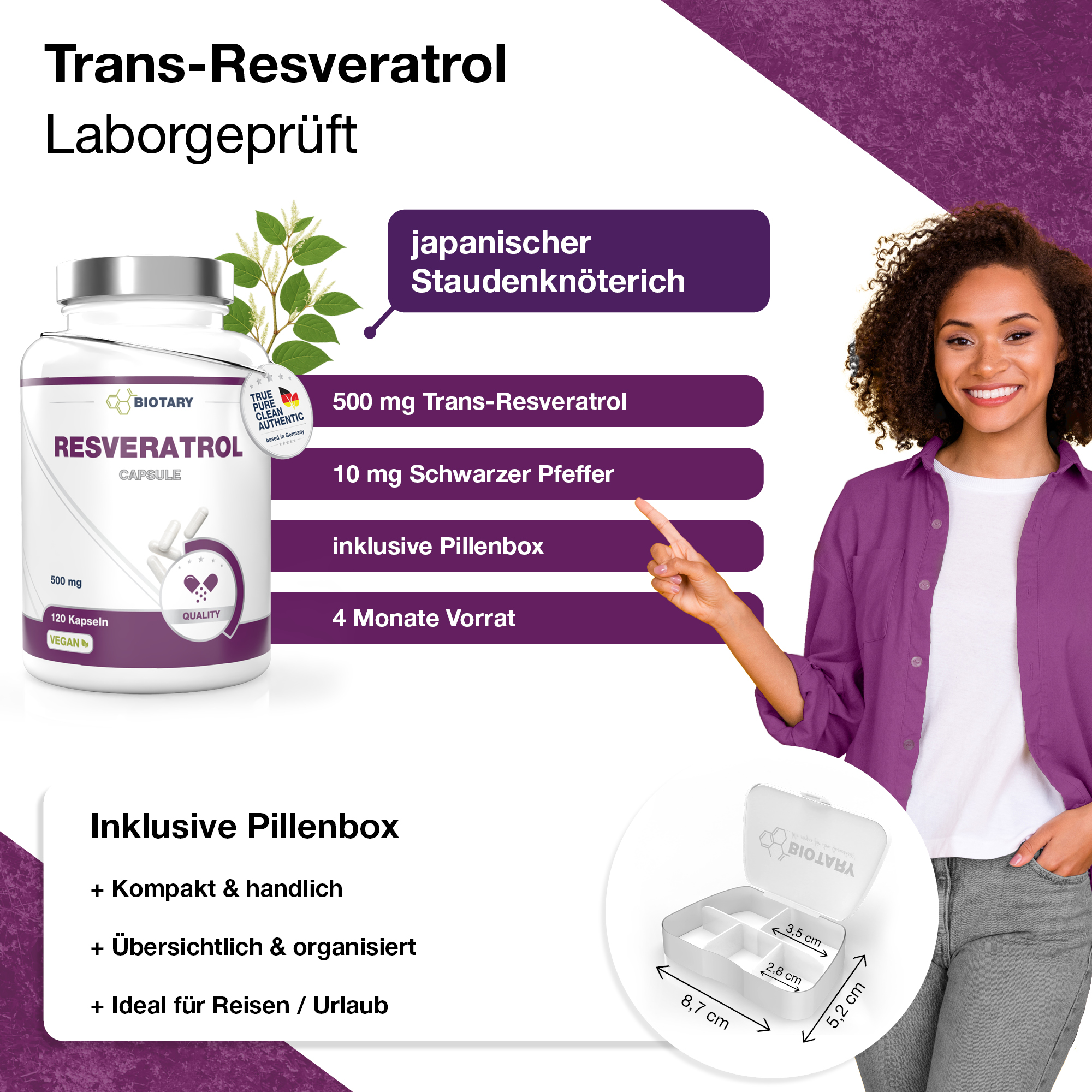 Japanischer Staudenknöterich-Extrakt (davon 98% Trans-Resveratrol), Hydroxypropylmethylcellulose (= pflanzliche Kapselhülle), schwarzer Pfeffer.