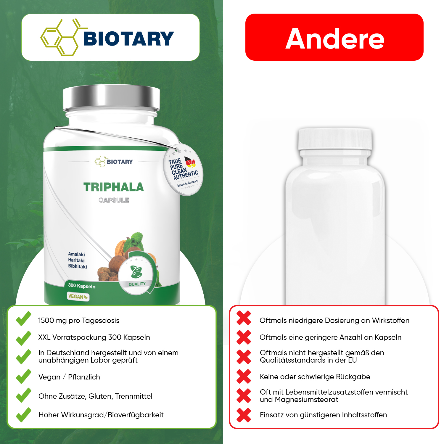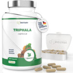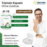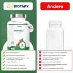 Tripahala Pulver aus Amalaki (indische Stachelbeere), Haritaki (rispige Myrobalanen), Bibhitaki (grüne Myrobalanen), Überzugsmittel: Hydroxypropylmethylcellulose (pflanzliche Kapselhülle), Trennmittel: Reis Extrakt Mischung